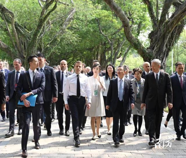 在中山大学党委书记陈春声、校长高松的陪同下,马克龙从怀士堂出发,沿着红砖绿瓦、树木葱茏的校园中轴线步行,感受古色古香的百年校园。