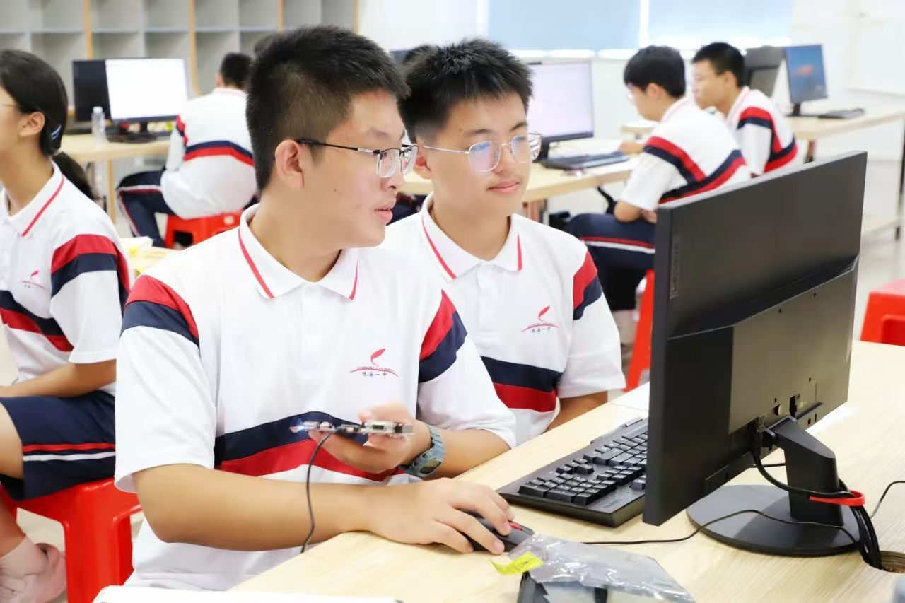 珠海市一中同学们在数字电路科创实验室里学习制作电路板。