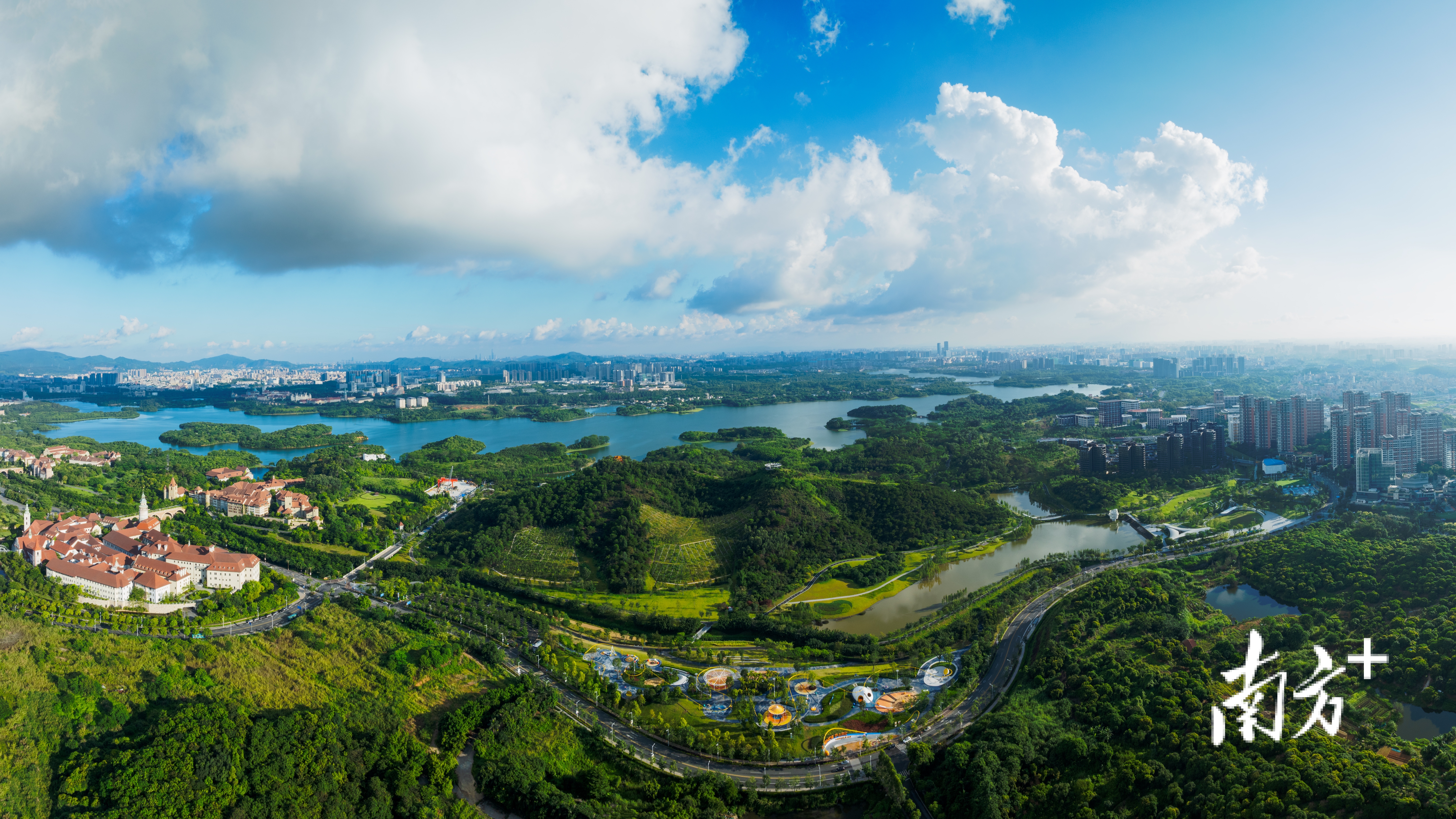 南依巍峨山、北面松山湖,以“越科学、越自然”为核心,打造科普广场、科学观鸟自然走廊、碳中和森林康养胜地等十大特色景点,儿童友好中子乐园入选国家儿童友好空间建设示范案例。山顶科学之眼融合光学声学科技,打造360°观景台,引导游客探索星空,开启自然与科技的双向奔赴。