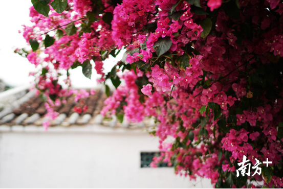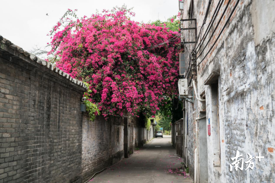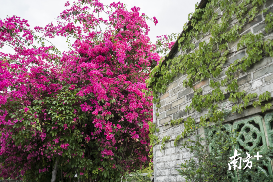 与可园的青砖古瓦相间,盛放的三角梅,显得更为艳丽。