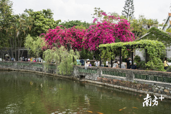 而在可园古建筑区的池塘旁边,成片的三角梅最受欢迎,几乎是游客路过必须要来“打卡”的地方。