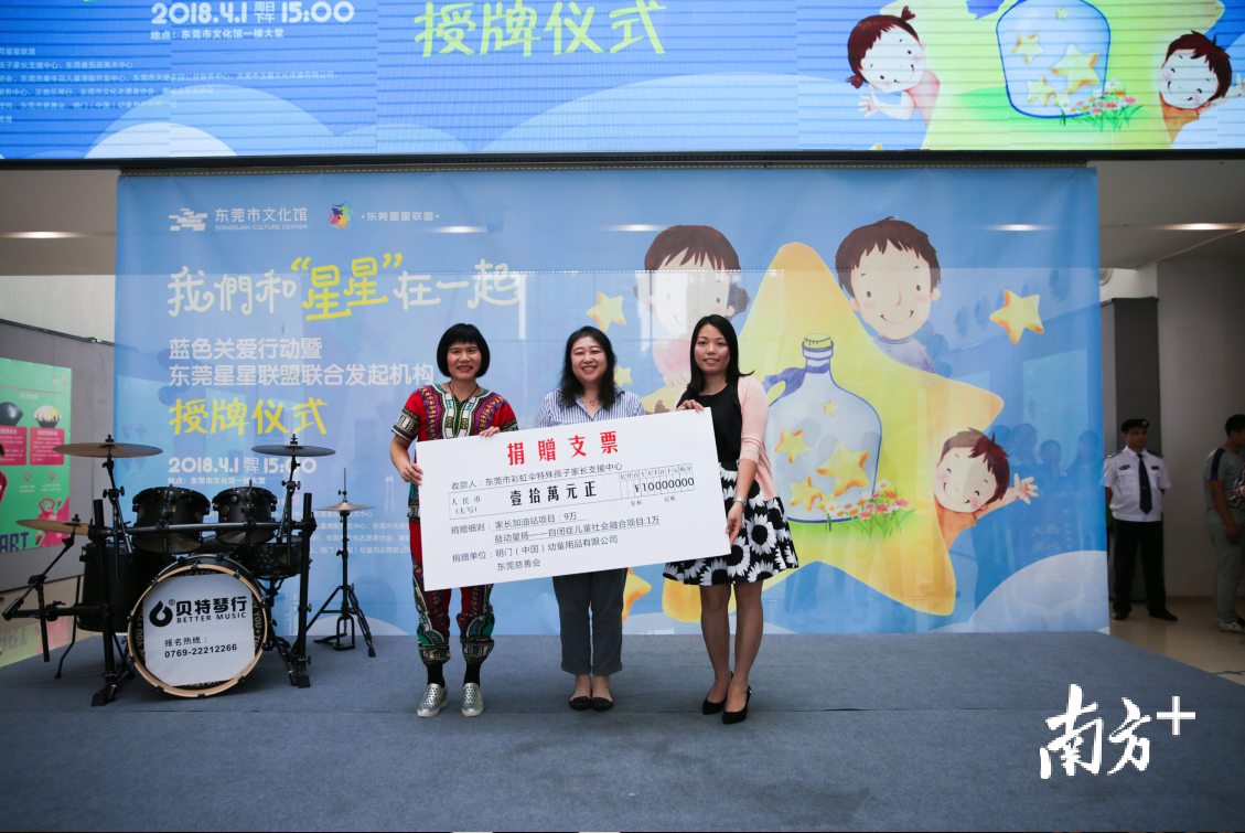除了各个发起机构,东莞星星联盟的前行也得到不少社会力量的帮助。纪念日当天,东莞市慈善会、明门(中国)幼童用品有限公司为东莞市彩虹伞特殊孩子家长支援中心(东莞星星联盟联合发起机构之一)的家长加油站项目以及鼓动星扬——自闭症儿童社会融合项目捐赠了价值共计10万元的关爱礼包。
