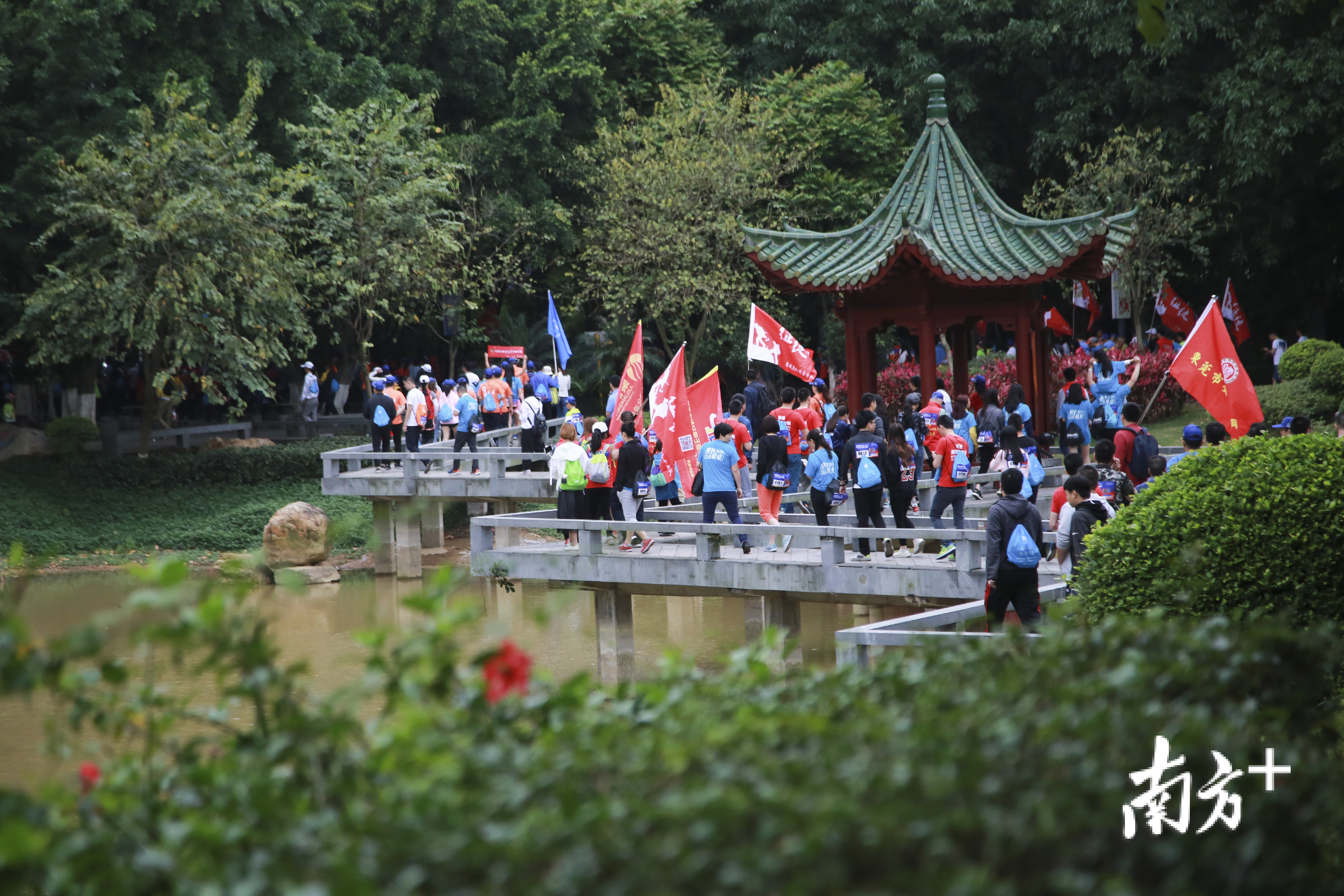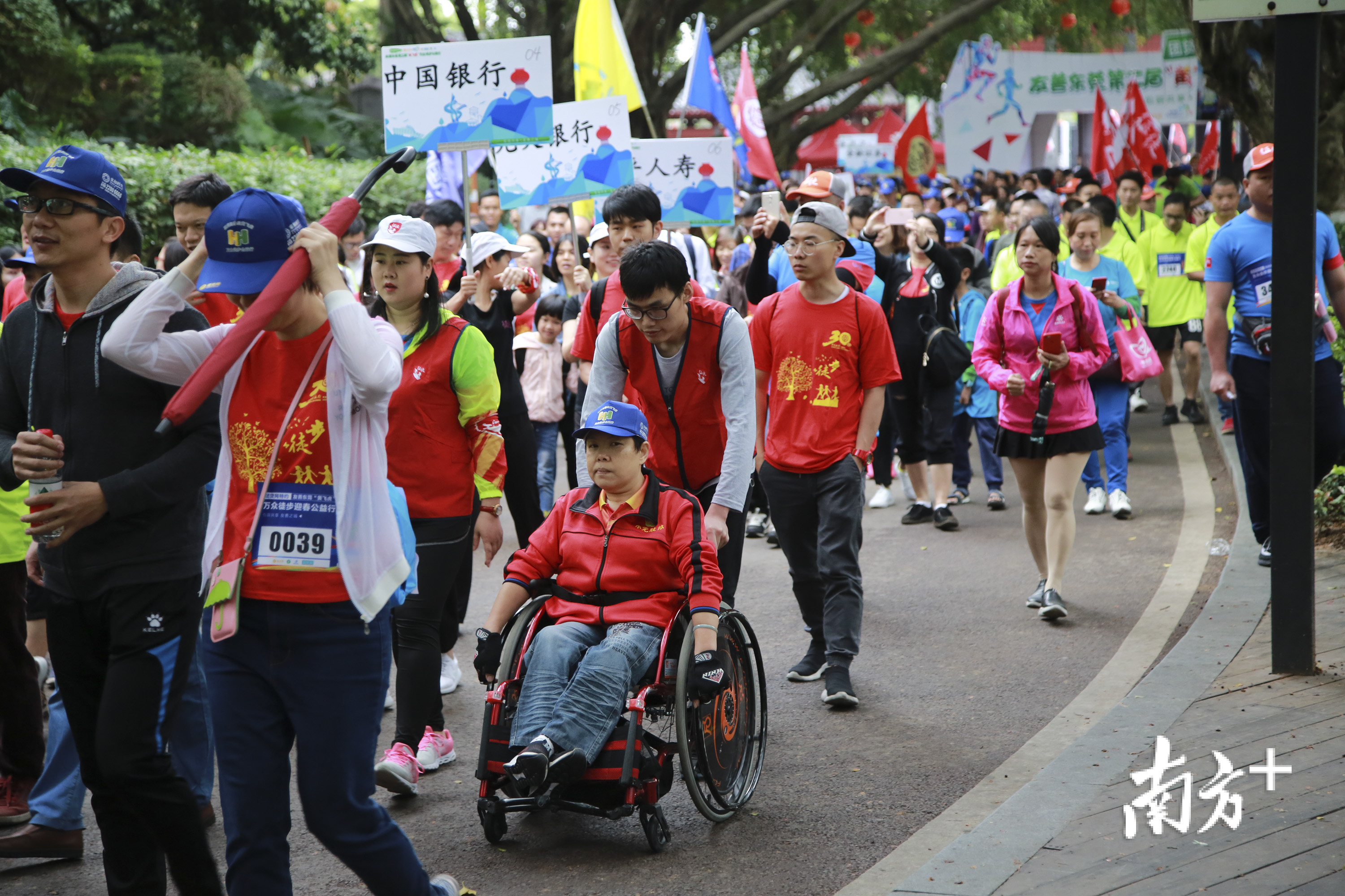 本次参加徒步活动的市民年龄跨度非常之大,最小的只有2岁,最大年纪的是85岁,今年的徒步现场还出现了一群特别的身影,他们在起点处互相鼓励,来往的人群也不禁向他们竖起大拇指加油,他们便是东莞轮椅运动队的成员,该团队成员在坚持锻炼的同时,也热心公益,鼓励残疾人走进社会。