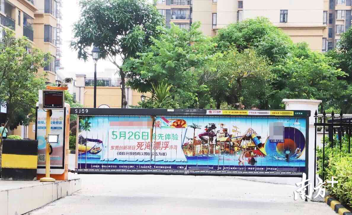 在石碣镇一小区,笔者看到地下停车场出入口门禁杆上有广告,上面是关于游泳培训的内容。