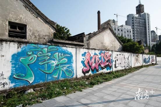 在这些废弃的旧楼前,围墙上那五彩斑斓的涂鸦显得分外夺目。