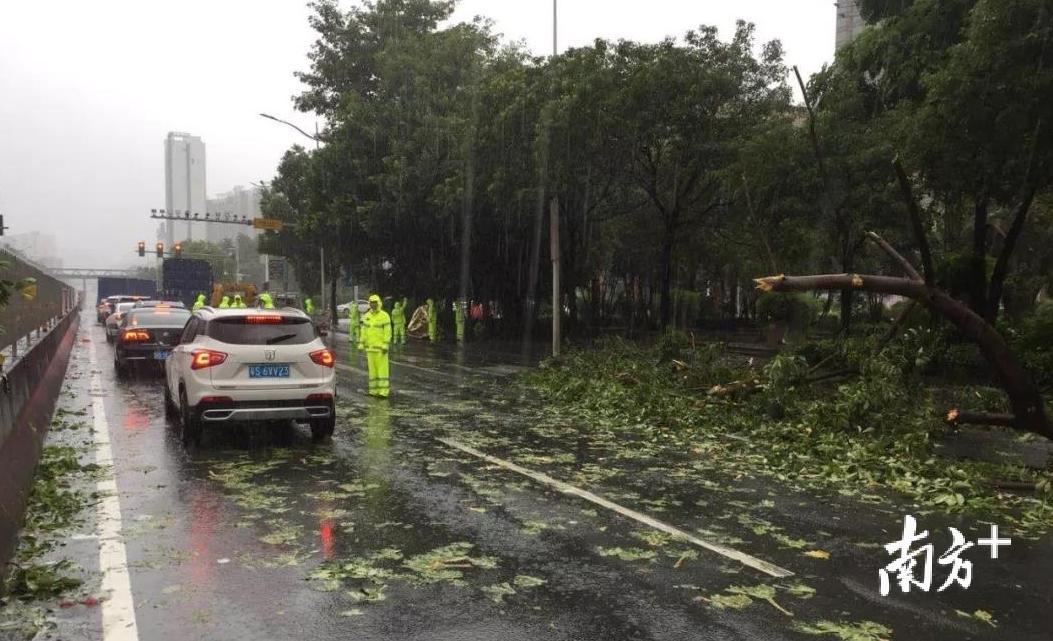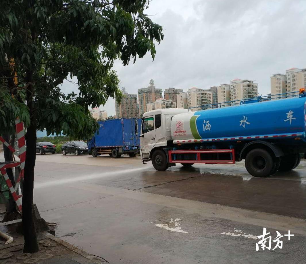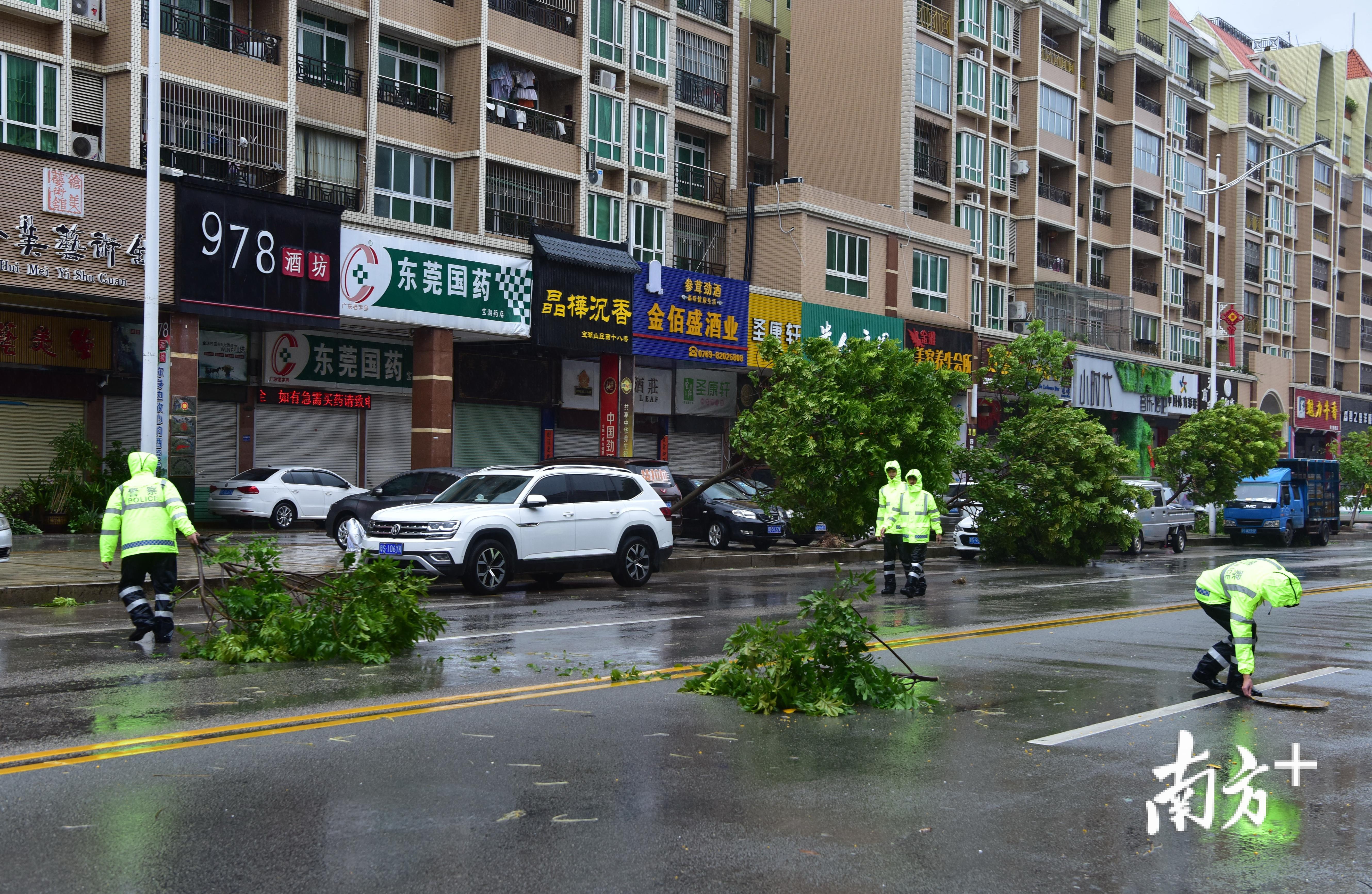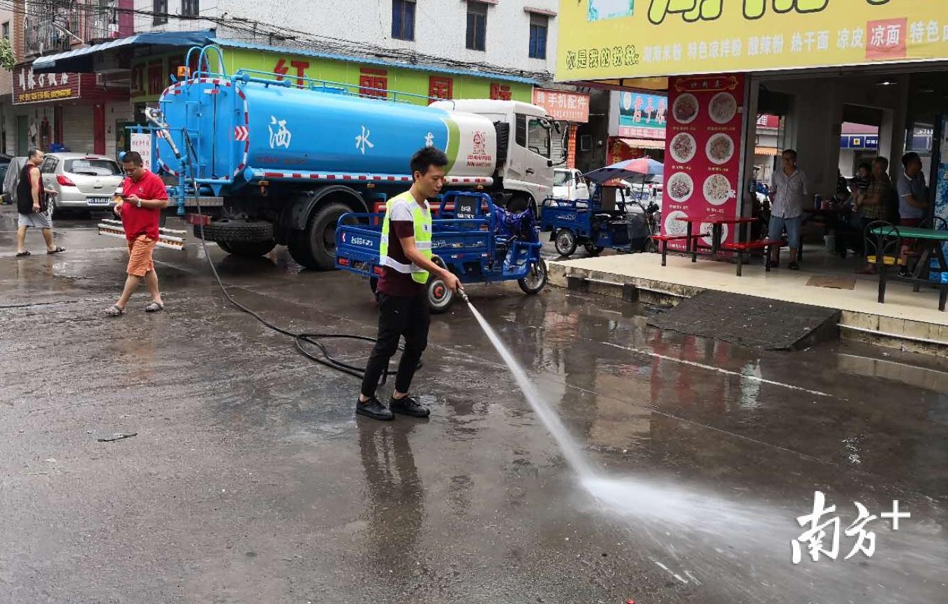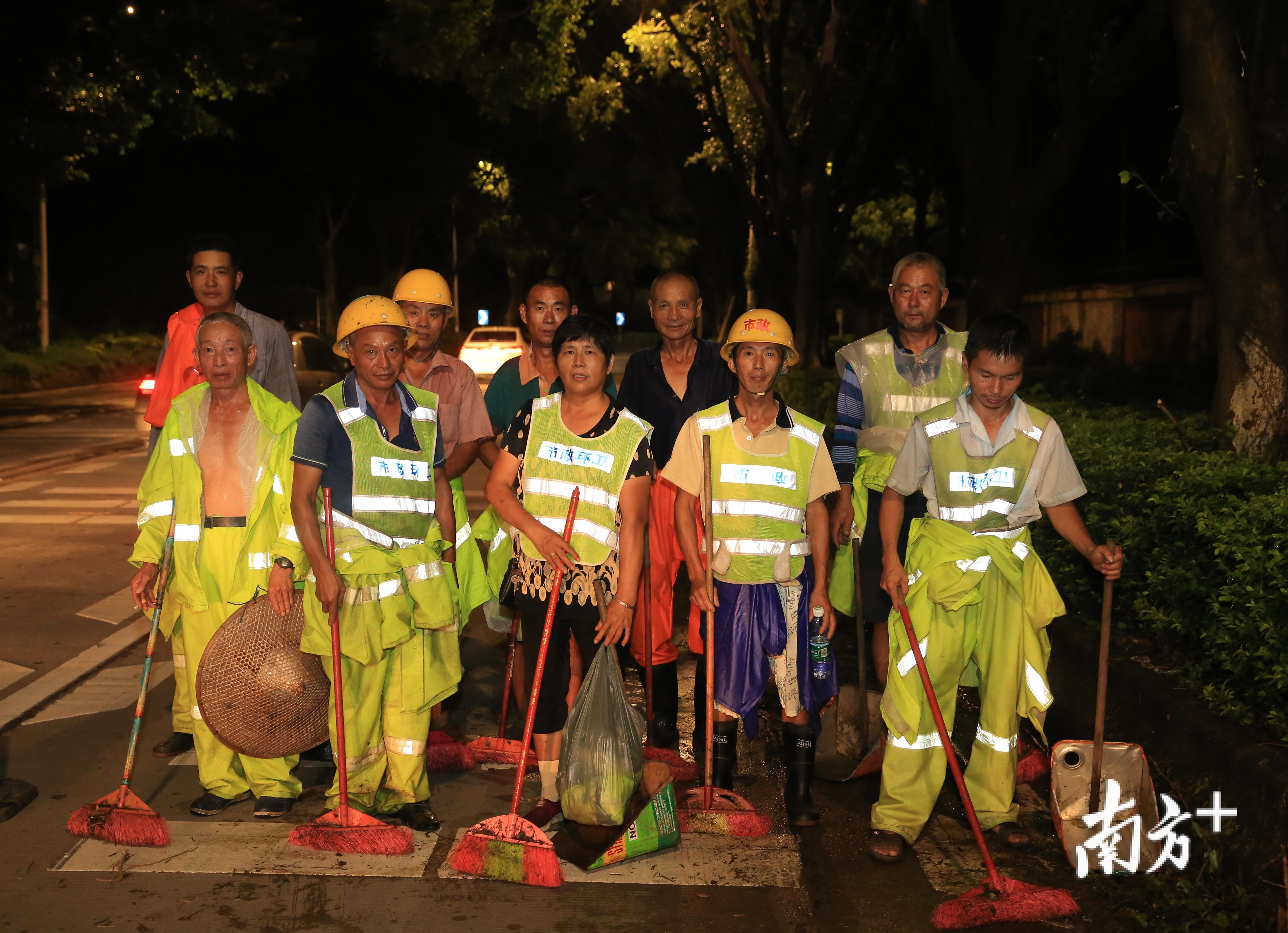 从“山竹”登陆前到17日夜晚,黄江的街头小巷,满是修复家园的忙碌身影。直到晚上17日23时许,东环路上仍能看到一排排穿着橙色衣服的环卫工人,正在清扫树叶、冲刷地面。