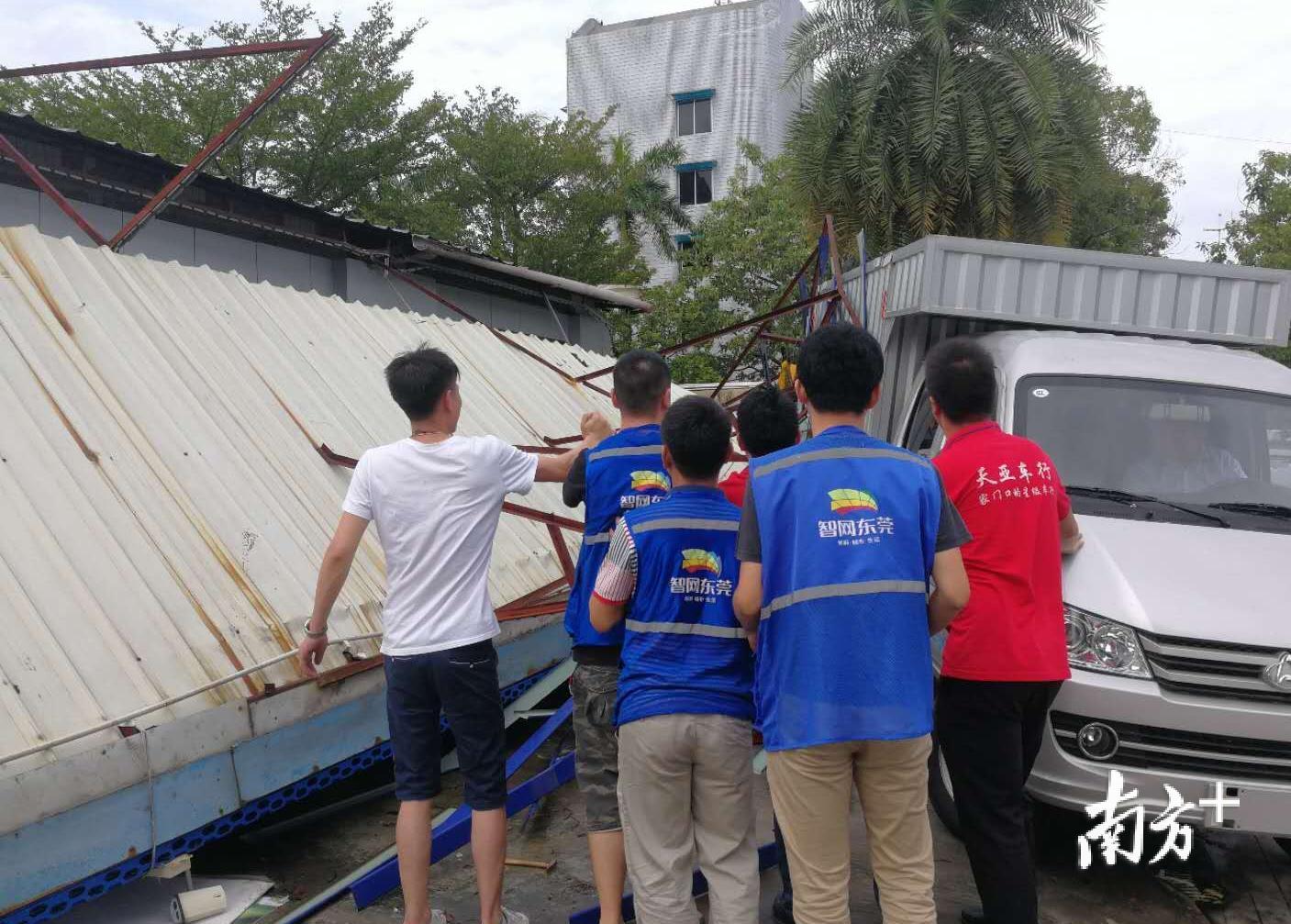 9月16日8时半,在狂风的肆虐下,黄江镇鸡啼岗村一居民楼的铁皮棚如宣纸般被撕开,狠狠地砸在5米之下的巷道上。此前,黄江公安、城管、消防以及当地村干部已经将处于危险区域的40多名居民转移到应急避灾中心。
