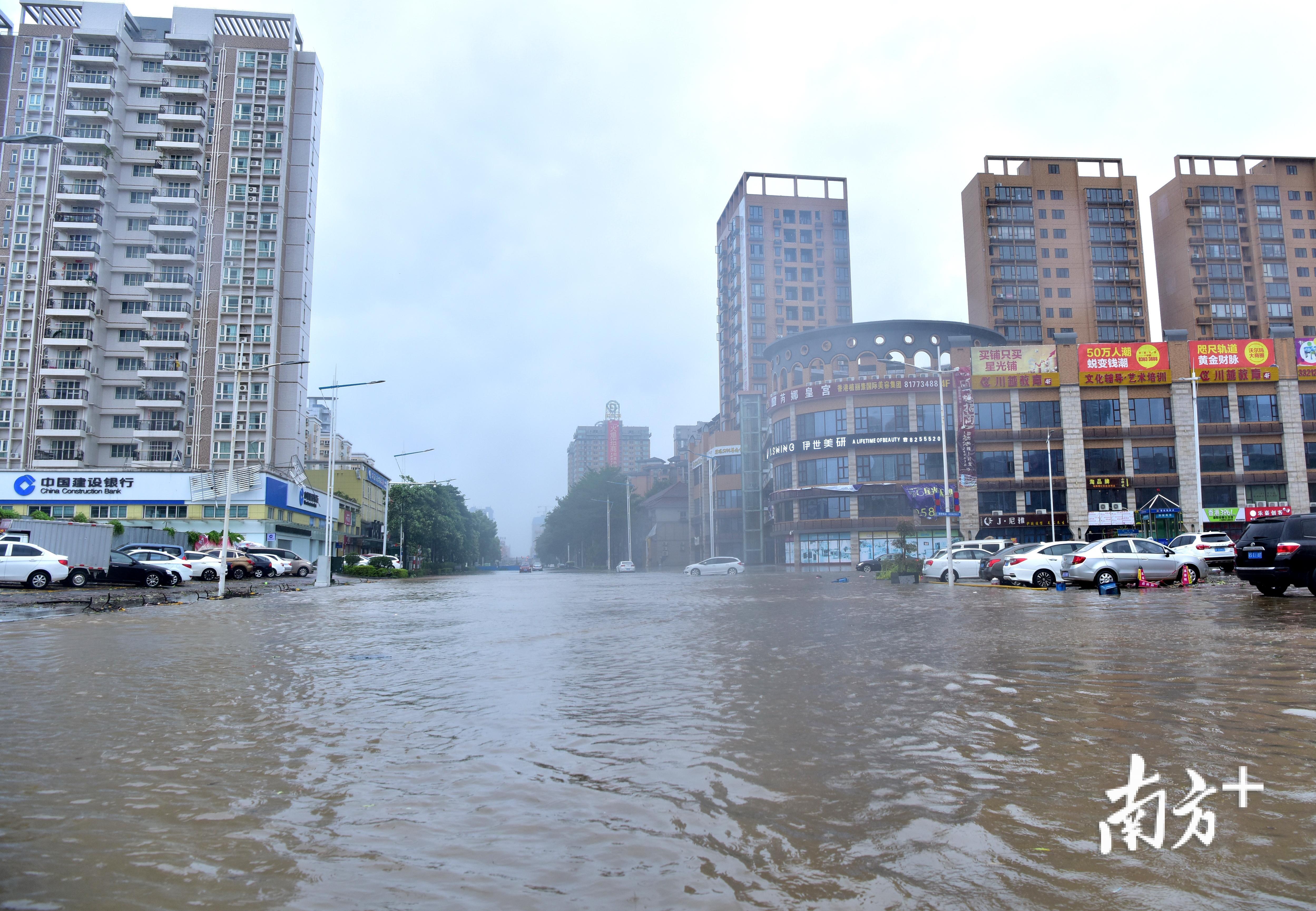 张金叶呆呆地站在原地,看着眼前的一片汪洋。环顾他的四周,从板湖村委会到中惠珺庭均被积水覆盖,路边的人行横道已经找不到了。由于积水太深,到此巡查的民警也只能放弃警车,艰难迈步前行。