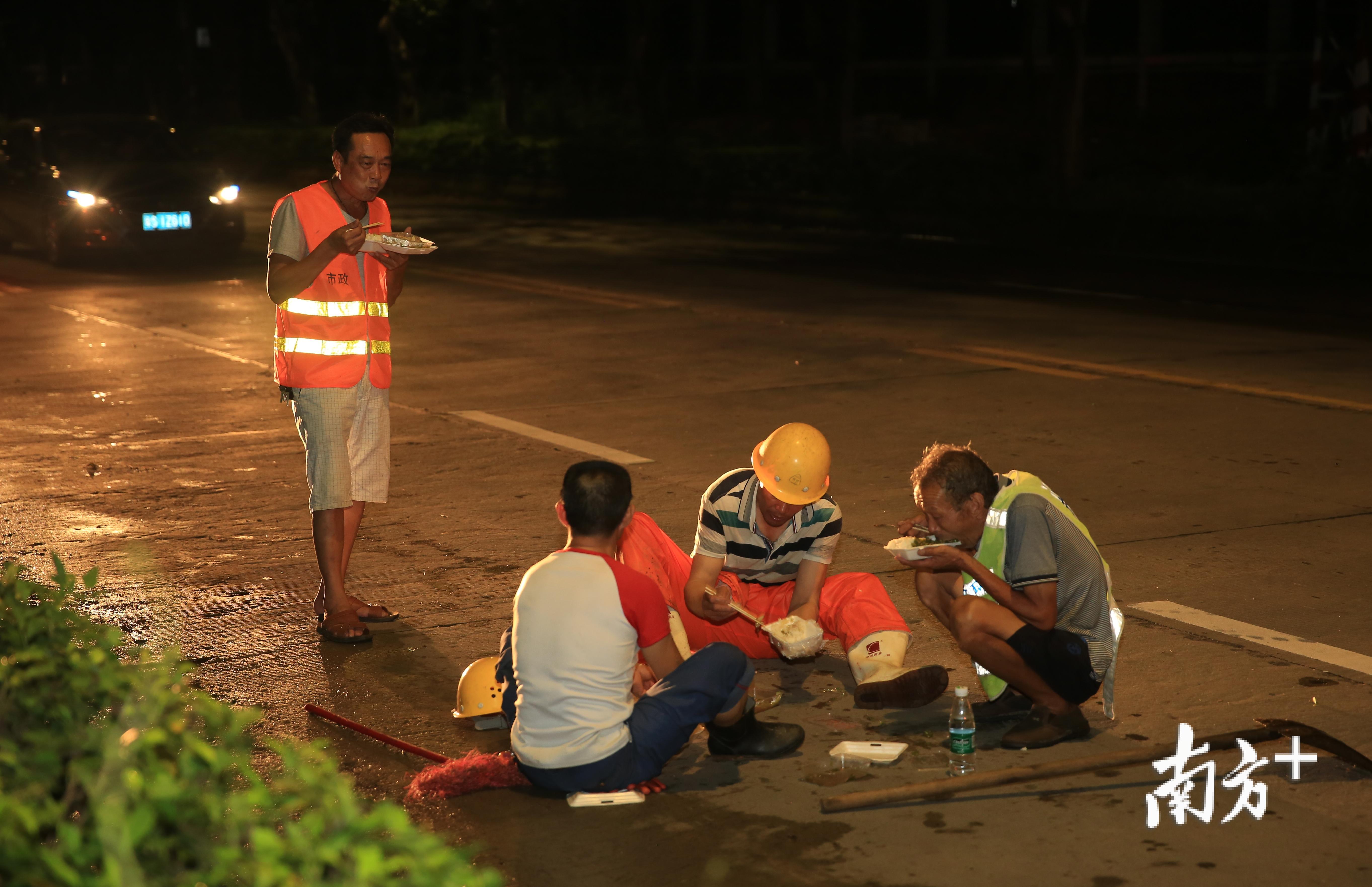 “早上五点就开始清理了,干了17个小时了,还差二公里就可以把东环路全部清理完毕。”一名环卫工人告诉记者,早餐、午餐以及晚餐他们都是在“路边解决的”,“回去马上冲凉睡觉,明天还要早起”。