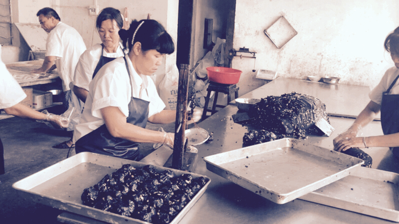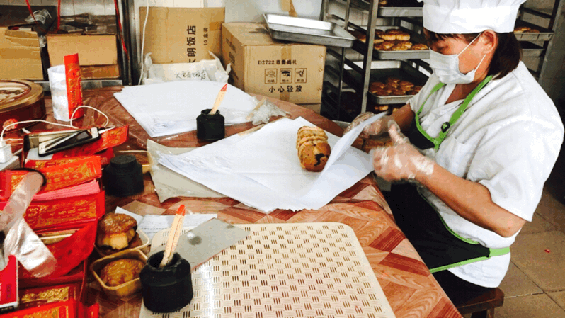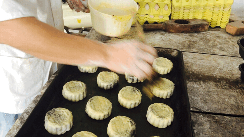 据叶爱英介绍,“牛屎月饼”从制造馅料到烤制,需要经过八道工序,总共用时六个小时。“仅一锅豆沙便需熬制4个多小时”。