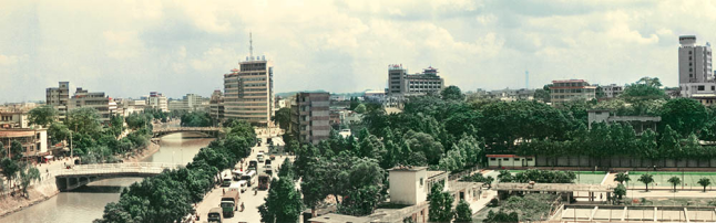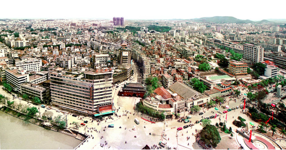 1988年,莞城全景。上世纪80年代东莞第一高楼——十三层的东信酒店矗立在运河边。右上角的东方酒店,其顶楼设有旋转餐厅。 陈锦波摄