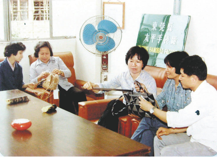 太平手袋厂员工向客户推介手袋。1978年9月15日,东莞首个“三来一补”企业——太平手袋厂落户虎门。