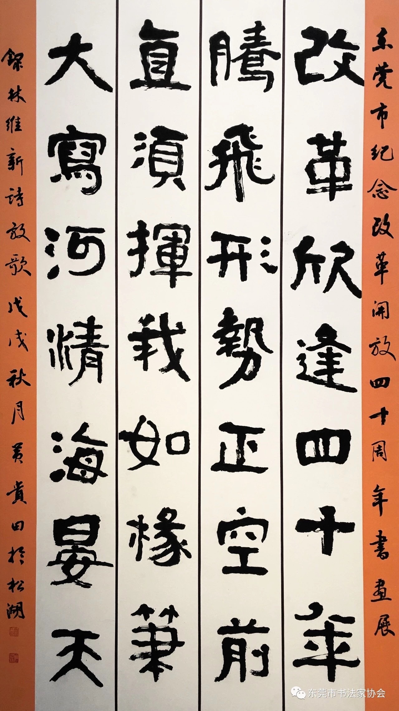 举办东莞市纪念改革开放40周年书画展览,是一个主题鲜明,紧扣时代的专题活动,作品内容必须扣题,故选林维新先生所作《放歌》一诗,既贴题而又大气。以本人较为擅长的隶书书写,直抒胸意,在笔法上取张迁、好大王、石门颂等名碑,同时兼融篆书、行书笔意,力达苍劲、古朴、苍茫、灵动之感;在章法上以竖幅书写,正文分四行谋篇布局,一行一句诗,便于读者(观众)直观欣赏,易读、易懂、易记、易接受;在款式上左右两边配以色宣,以行书题款,自然得体,落落大方,更显喜庆之感。