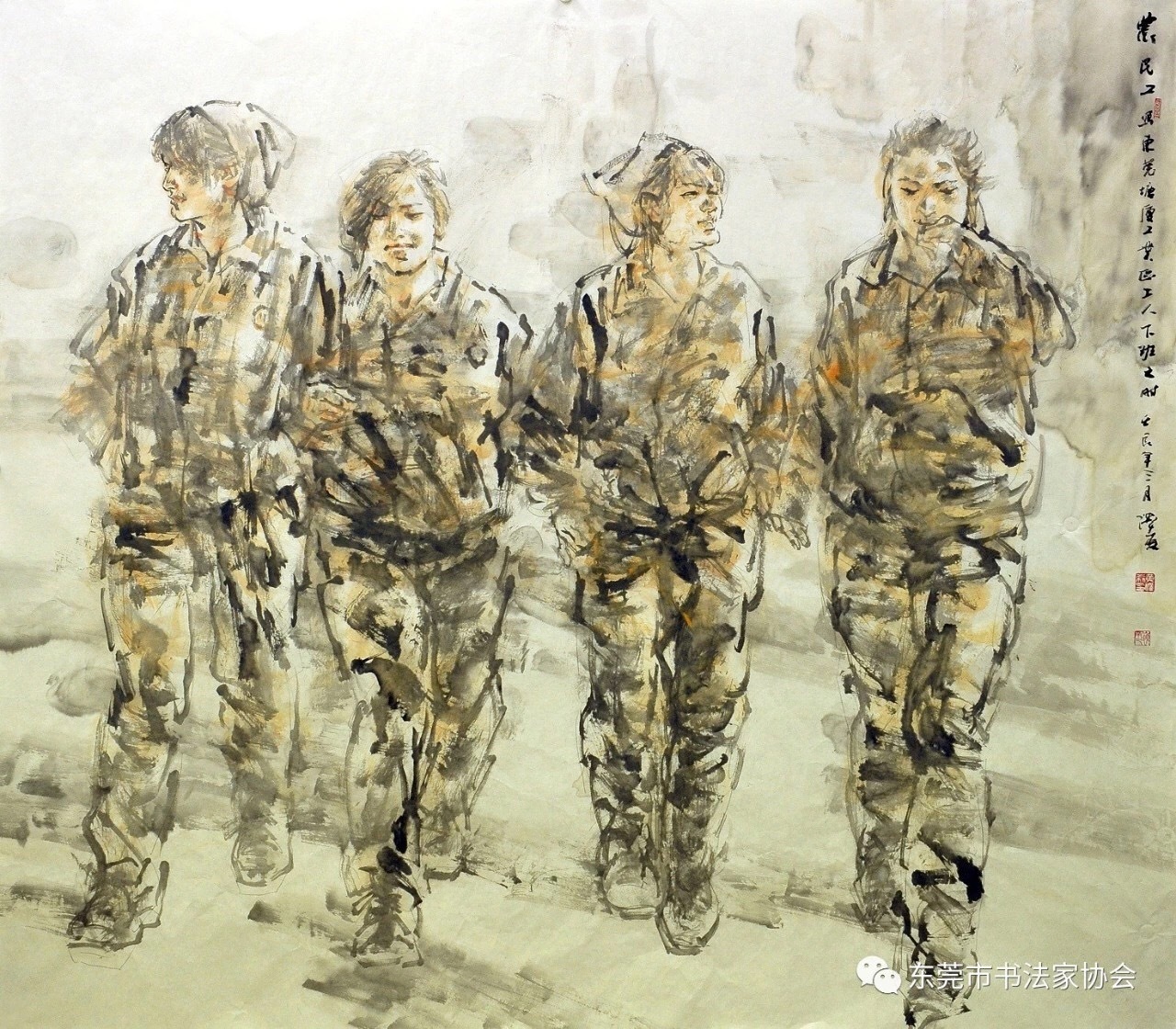 作者近年来经常到工厂企业,画先进人物和产业工人的形象。这里描写的工厂女工的群象,表现新时期东莞工业区群体的人物,在他们的形象中,体现时代的风貌和乐观向上的精神。
