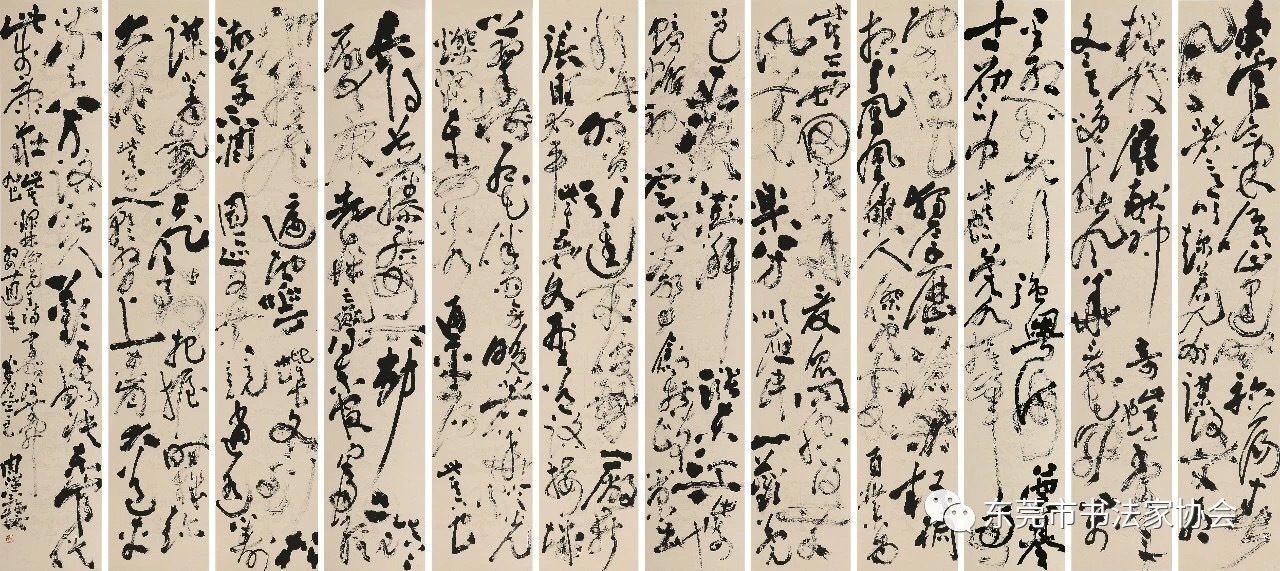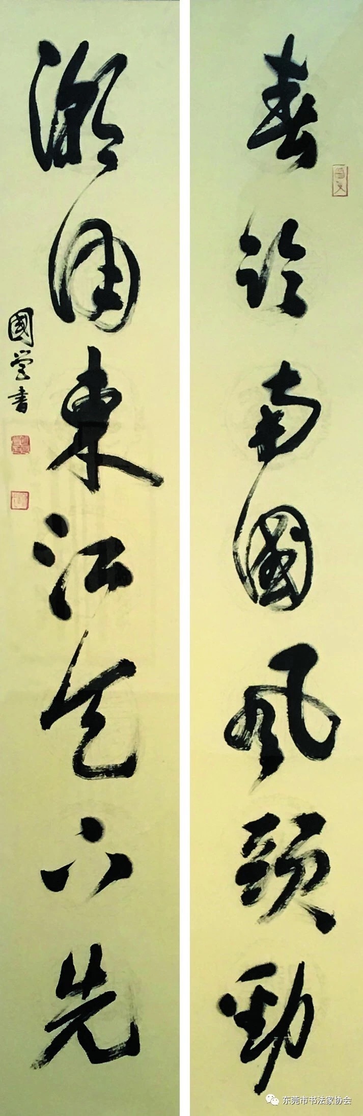 创作手记:以草书笔法书联,籍改革开放之春风,突出东莞敢为人先的创新精神。在笔势上,一气呵成,力求气韵贯畅;在字里行间注重上下连贯,起收自如,犹如一泻千里之快感。