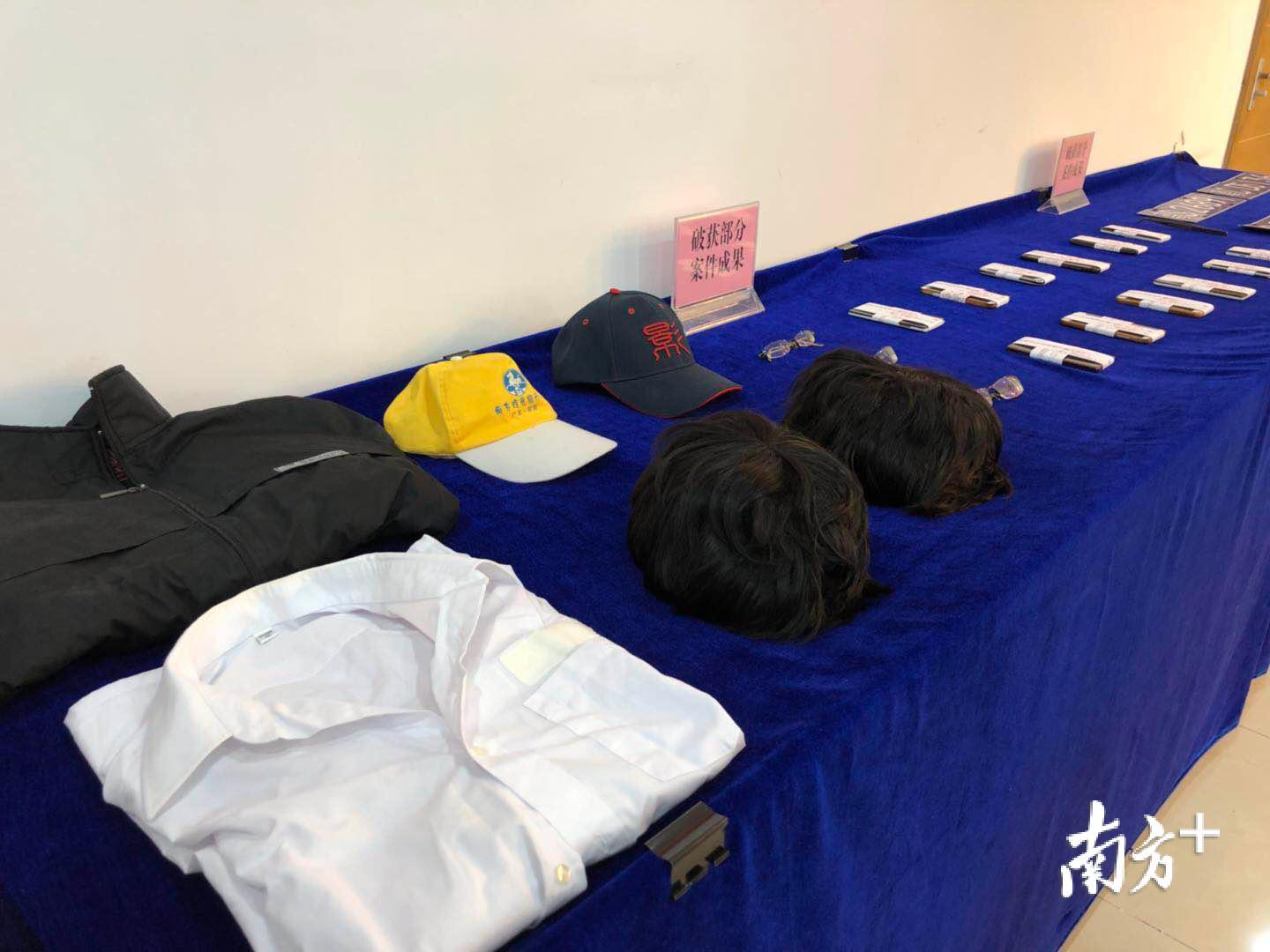 这次发布会的“展品”有点不一样,假发、眼镜、鸭舌帽、外套大衣是警方俗称的“四件套”,另外有一批贴着封条的手机、多个假牌照,同时配上一张专项行动成果横幅。