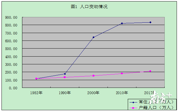改革开放以来,东莞市经济高速发展,就业需求剧增,大量外来人口流入,东莞1982年常住人口只有115.30万人,2017年增长至834.25万人,35年间增加了719.0万人,年均增长高达6.0%。
