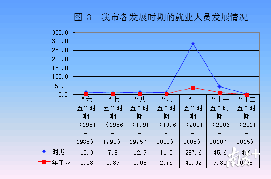 40年来,东莞就业人员总量保持增长态势。从各发展阶段来看,“十五”时期就业人员规模扩张最快,2005年比2001年增长287.6%,年平均增长高达40.32%。“十一五”时期增长速度快速下降,但增速仍然高达45.6%,年均增速达9.85%。“十二五”时期,就业人员增长速度最慢,达到各个时期的最低点。