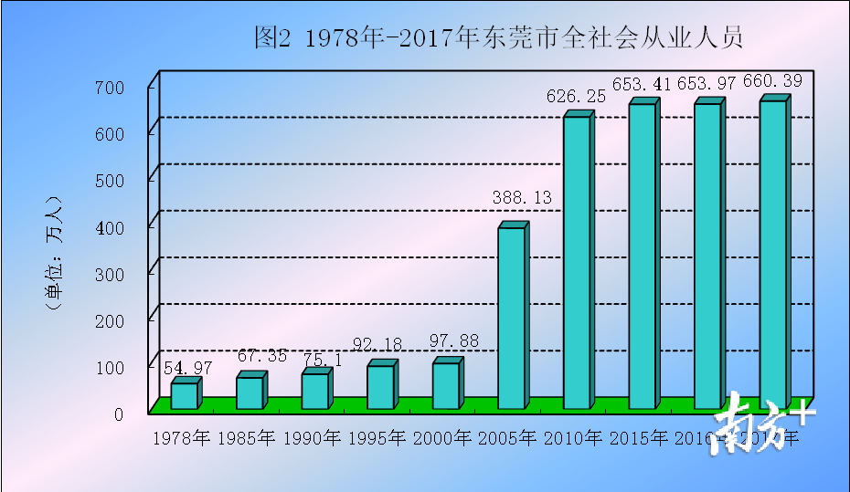 2017年末,东莞市全社会从业人员660.39万人,与1978年的54.97万人相比,增加605.42万人,平均每年增加15.52万人,年均增长6.58%。