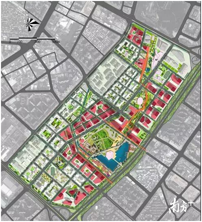 “两轴”指纵向,沿经三路从北向南打造一条连续的绿色人文廊道,廊道长约2.4公里,串联南城国际商务区内各个主要功能片区。横向,沿新基河生态廊道打造滨水景观休闲轴,周边布局各色活动场地。