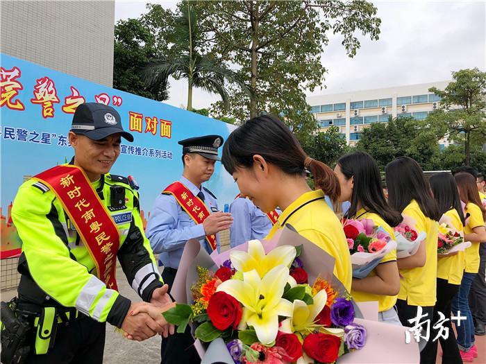 随后,9名“新时代南粤民警之星”东莞公安候选人登台亮相,群众代表献花致谢。候选人中有三十年如一日的“社区老黄牛”,有奋战在扫毒第一线的“缉毒先锋”,也有风驰电掣快速处置持刀砍砸运钞车歹徒的“仁心铁骑”。9名候选人来自不同的岗位,被称为东莞公安的高人、能人、达人、强人。