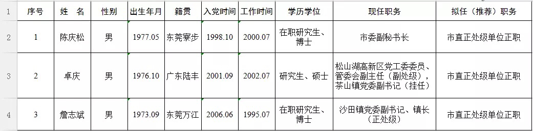 11月20日,东莞市委组织部发布市管干部任前公示通告:经市委常委会议研究,陈庆松、卓庆、詹志斌3位同志拟提拔使用(名单见附表)。根据《党政领导干部选拔任用工作条例》的规定,现予公示,征求党员、群众和单位的意见。