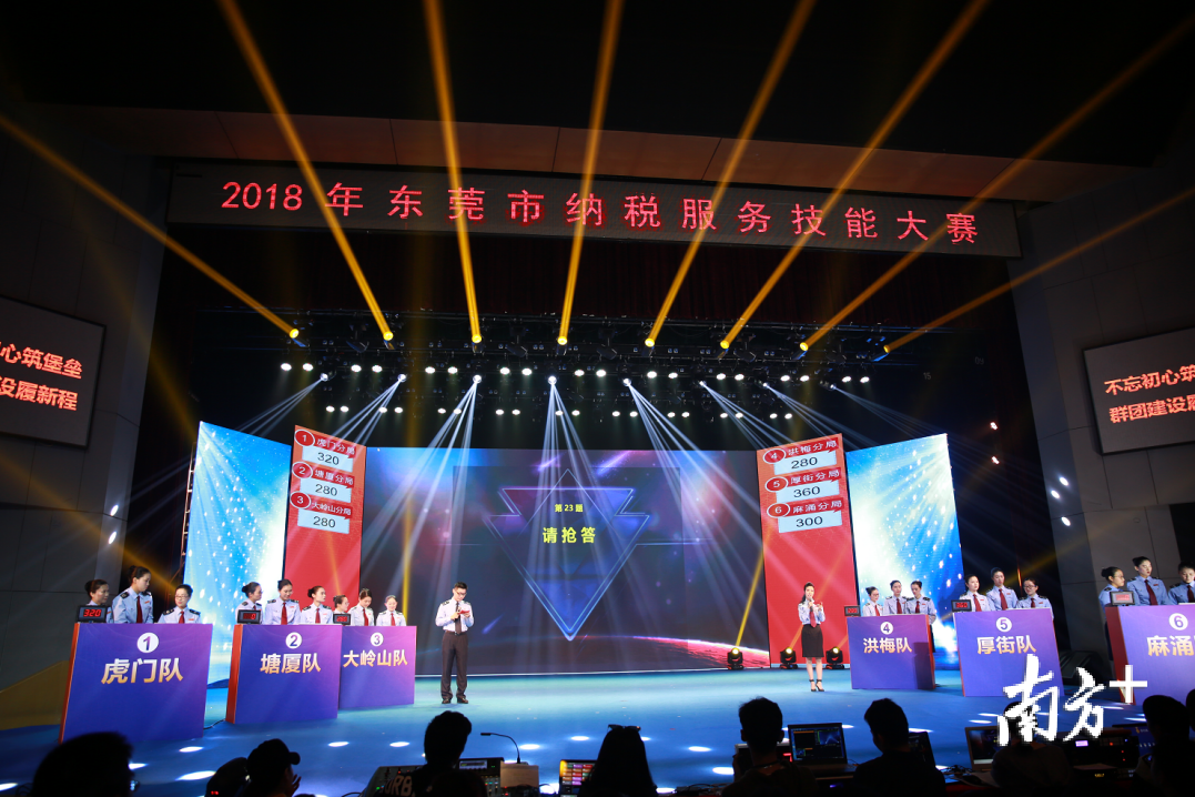 11月28日下午,由东莞市总工会、国家税务总局东莞市税务局联合举办的2018年东莞市纳税服务技能大赛团体决赛在东莞市民艺术中心星剧场举行,广东省税务局党委委员、副局长梁世桃,东莞市总工会主席陈锡江,以及东莞市税务局党委全体委员等相关领导出席了活动,与现场近500名税务人员及观众共聚一堂,共同见证了晋级团体决赛的六支队伍的激烈比拼和“东莞市五一劳动奖状”获奖团队单位的诞生。