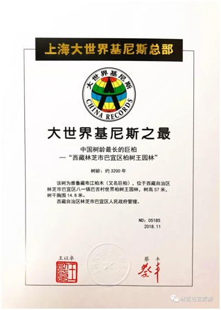 近日,西藏林芝市巴宜区巴吉村内最大一棵巨柏——“世界柏树王”凭借3200多年的树龄,被确认为"中国树龄最长的巨柏",并获得由上海大世界基尼斯总部颁发的"大世界基尼斯之最"证书。