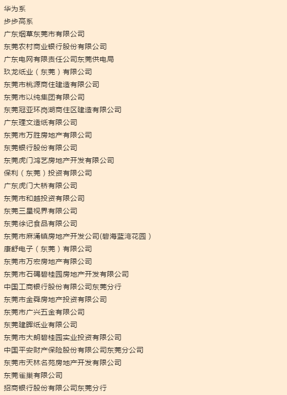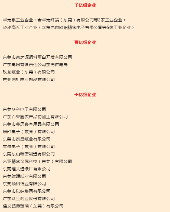“2018年度东莞市规模效益成长性排名前20名企业”榜单居于众榜单之首。其中,华为系工业企业(含华为终端(东莞)有限公司等2家工业企业)、步步高系工业企业(含东莞市欧珀精密电子有限公司等5家工业企业)两家企业,继2016年首次历史性实现东莞企业主营收入破千亿元后,连续第三年进入千亿企业榜。同时,这两家企业也名列“2018年度东莞市主营业务收入前20名企业名单”、“2018年度东莞市效益贡献企业名单”前两位。