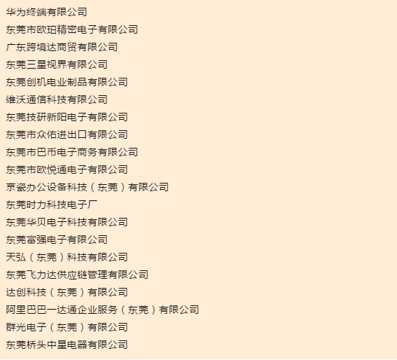“2018年度东莞市实际出口总额前20名企业名单”中,华为终端有限公司、东莞市欧珀精密电子有限公司分别名列第一、第二,维沃通信科技有限公司则从上一年的第四名降至第六名。