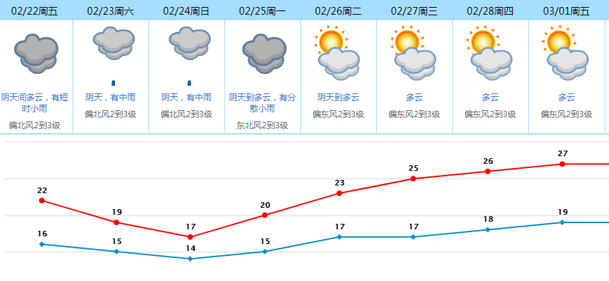 2月22日:阴天间多云,有短时小雨,气温17到22度,偏北风2到3级;
