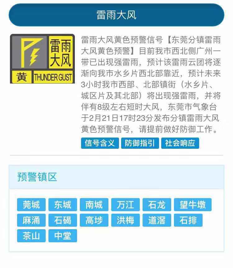 东莞市气象台于2月21日17时23分发布分镇雷雨大风黄色预警信号: