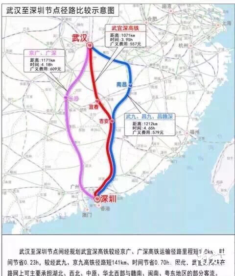 一旦建成,将形成武汉到深圳的一条笔直线路。初步预测分析,新规划的武汉至深圳高速铁路,较经京广、广深高铁运输路径短100多公里,时间节省20分钟;较经武九、京九高铁路径短141公里,时间节省42分钟。