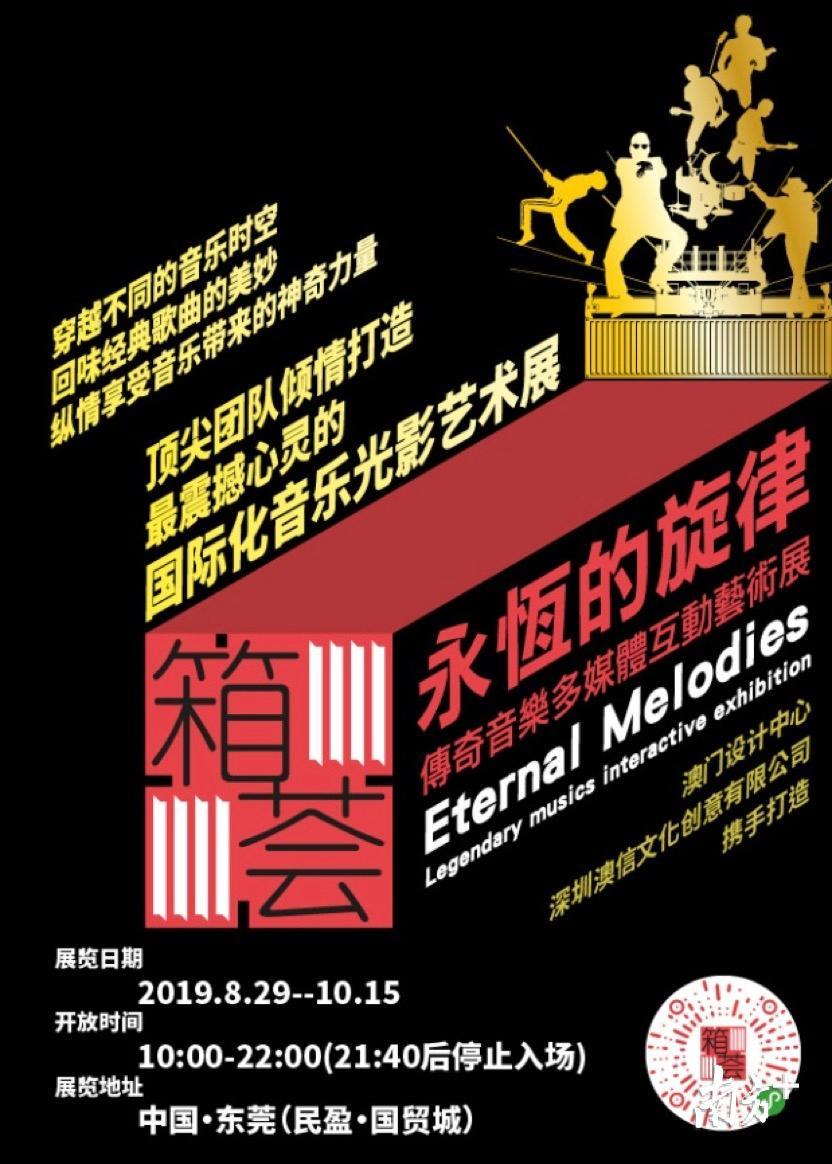 《永恒的旋律》传奇音乐多媒体互动艺术展集音乐、艺术与动感的集装箱形式,将以巡回展的方式把这个文化艺术体验的创举项目带到全国各地。该展以十三个集装箱互动体验空间展现,结合音乐、艺术、光影、感应技术、灯光装置、互动游戏等,展区涵盖了全球音乐文化中最具代表性及影响力的乐曲 ,包括华语情歌经典之作《甜蜜蜜》、粤语流行巅峰《海阔天空》、为世界和平带来力量的《江南style》、飞跃冰雪世界的《Let It Go》等经典名曲,给观众带来360度全方位视觉、听觉及触觉的震撼,进入前所未有的音乐艺术之境。