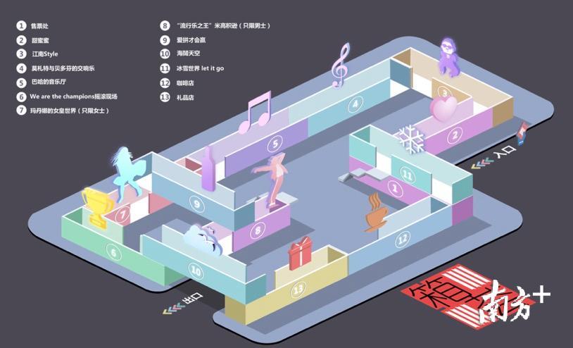 整个展区由13个集装箱组成,2-10号箱是展览空间,分别由10个各具特点的音乐主题组成,1号箱是售票处及资讯站,12号咖啡店及13号礼品店里的惊喜亦都不容错过,12号箱还可以点唱自己喜欢的歌曲。