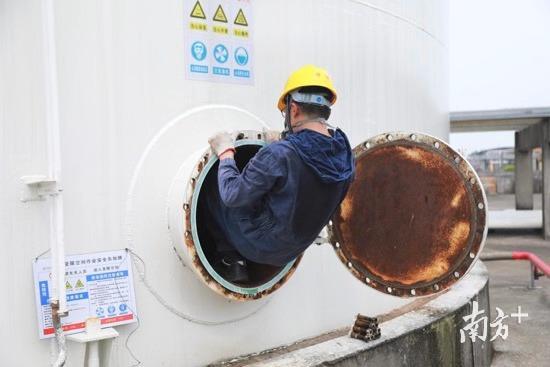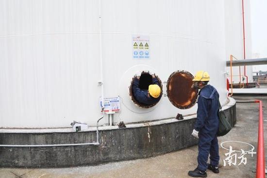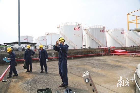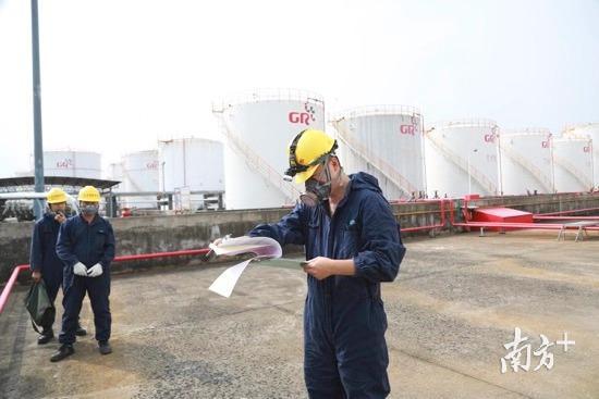搬着沉重的设备,罗淦明、苏志坚等几名检验员来到东莞三江储运危化品储存区,这里林立着三层楼高的白色储罐。