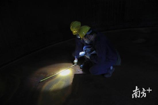 检验员们通过漏磁检测仪、测厚仪、射线检测仪等设备,像医生听诊一样,对储罐底板腐蚀情况进行检测,一处处测量板壁厚度,检查液位计、呼吸阀等安全附件是否有效等。苏志坚说:“检验过程要十分仔细认真,记得有一台罐,罐底发现好几条贯穿裂纹,特别危险。”