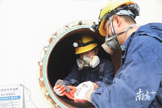 一个被清空的常压储罐底部,入口的圆孔已打开。检测院技术服务拓展室主任胡柱强先将气体检测仪放入储罐,仪器显示氧气20.8%,易燃易爆气体为零,指标符合要求。大家戴上防毒面具,逐个从圆孔爬进储罐。圆孔只有石磨大小,胡柱强开起玩笑:“再胖点就爬不进来!”