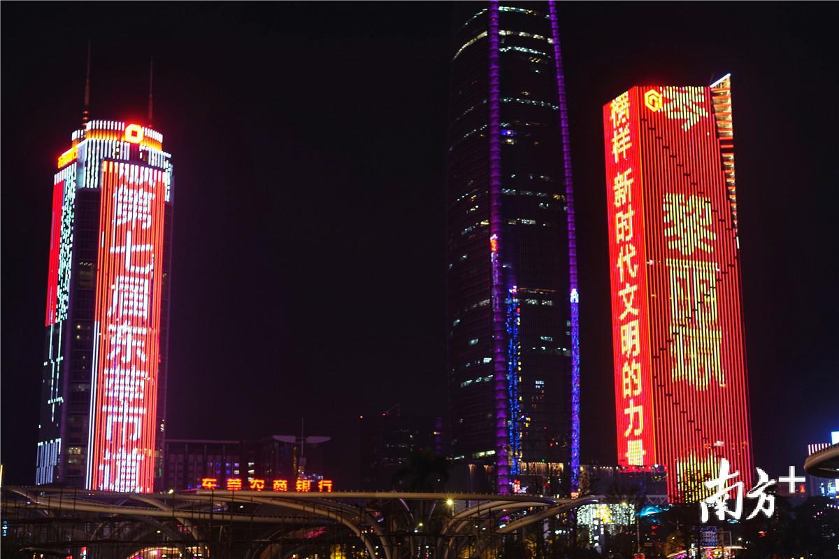 晚上7时,南方+记者在市民广场看到,“致敬第七届东莞市道德模范”等字幕和道德模范们的姓名在民盈国贸大厦、环球经贸中心、东莞农村商业银行等多处地标建筑楼外立面滚动展示。