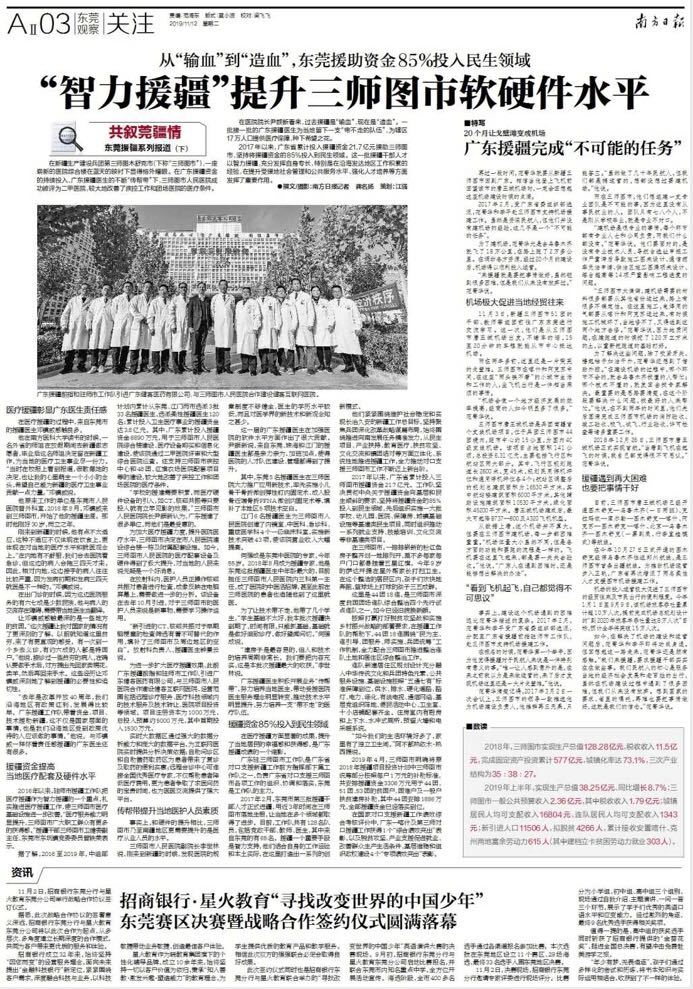 2017年2月,东莞市第三批援疆干部人才正式进疆,用近3年时间在三师图市落地生根,让当地在多个领域都取得了进步。目前,工作队共有128名队员,包括党政干部、教师、医生,其中来自东莞的有65名。援疆一个重要手段是智力支持,他们结合自身的工作经验和本土实际,在这里打造出一系列的创新模式。