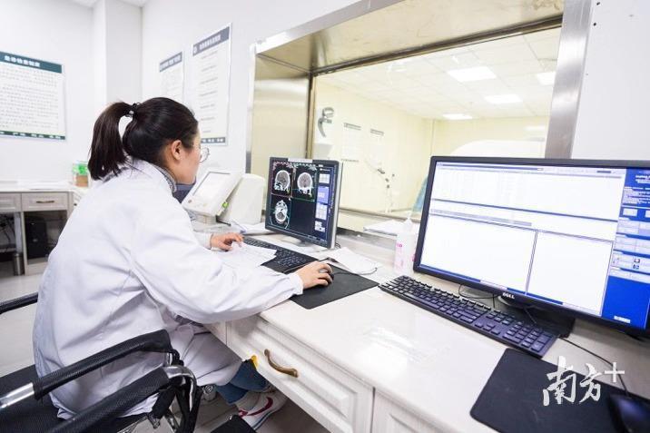 在放射科内,医护人员正操作核磁共振对患者进行检查,成像反映在电脑屏幕上,需要做进一步的分析。该设备在去年10月引进,对于三师图市的医护人员来说是新事物,需要学习操作运用。