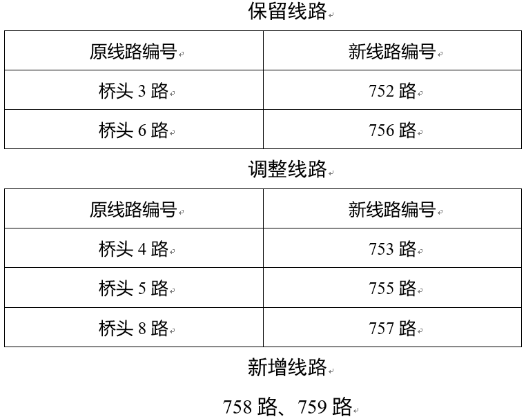 桥头镇原有公交线路5条,东莞巴士公司承接公交线路经营权后,对所有线路以“7”字头重新编号,保留2条线路站点不变,优化调整3条线路,并新增758、759两条线路。桥头4路调整为753路后,增加了对正丰豪苑、宏远帝庭山等小区的覆盖,并延长至樟木头振通车站,方便桥头镇中心乘客前往樟木头;桥头5路调整为755路后,终点站调整至常平南城轨站,方便大洲村、田头角村乘客便捷前往常平火车站、常平南城轨站换乘铁路出行;桥头8路调整为757路后,终点站由田头角延长至常平车站,方便桥头镇中心乘客前往常平车站换乘更多线路;新增758路连接桥头禾坑村、田新村、朗厦村、三和盛公司及桥头镇中心等地;新增759路连接北师大石竹附属学校、富盈御荷、迳联村、桥头镇中心、桥东片区及惠州潼湖永平村交界处,乘客可在永平交界处换乘惠州321路前往惠州潼湖、陈江、仲恺等地。