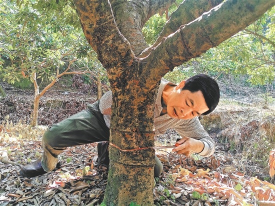 “环割的时机很重要,必须在10月底至11月完成,如果割晚了,将会影响荔枝树休养、储集能量,对来年开花结果不利。”李满田为了赶时间,从早上5点开始,一直忙到天黑。
