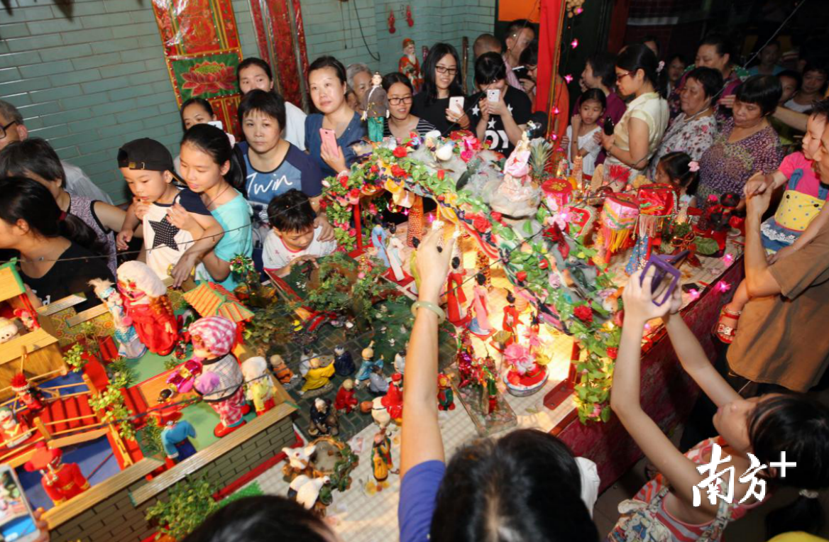 每年农历七月初七,是中国传统的“乞巧节”。“七夕”在水乡各镇历来都是一个颇受重视的节日,精致的七夕贡案总能成为镇里一道热闹的风景,不少群众晚饭后携家带口前来观赏贡案,现场排起内三外三层的一条条长龙,轮候看“七姐”芳容。