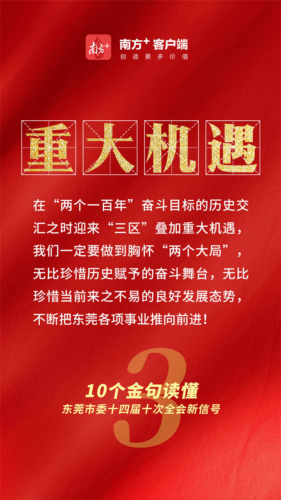 在“两个一百年”奋斗目标的历史交汇之时迎来“三区”叠加重大机遇,我们一定要做到胸怀“两个大局”,无比珍惜历史赋予的奋斗舞台,无比珍惜当前来之不易的良好发展态势,不断把东莞各项事业推向前进!