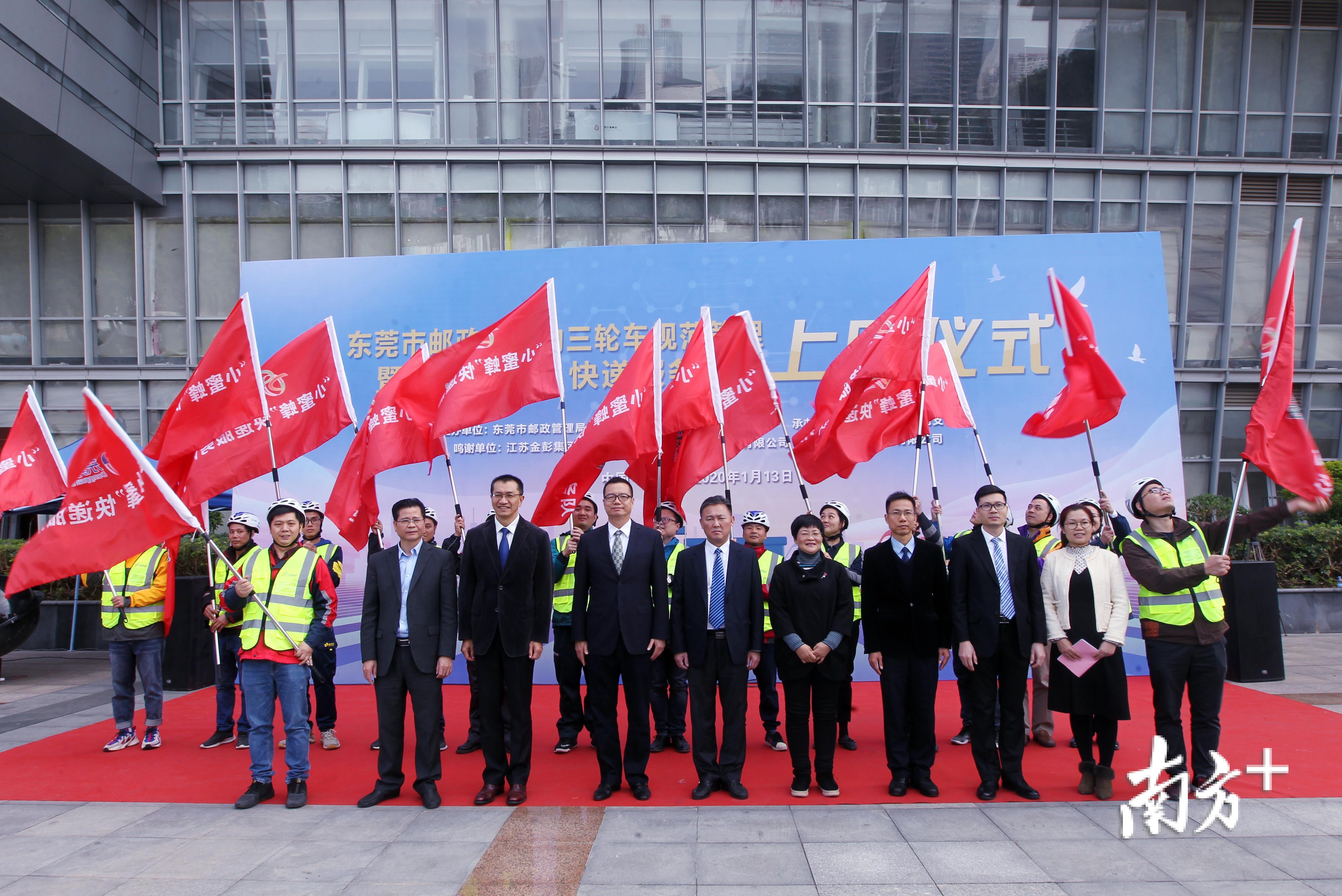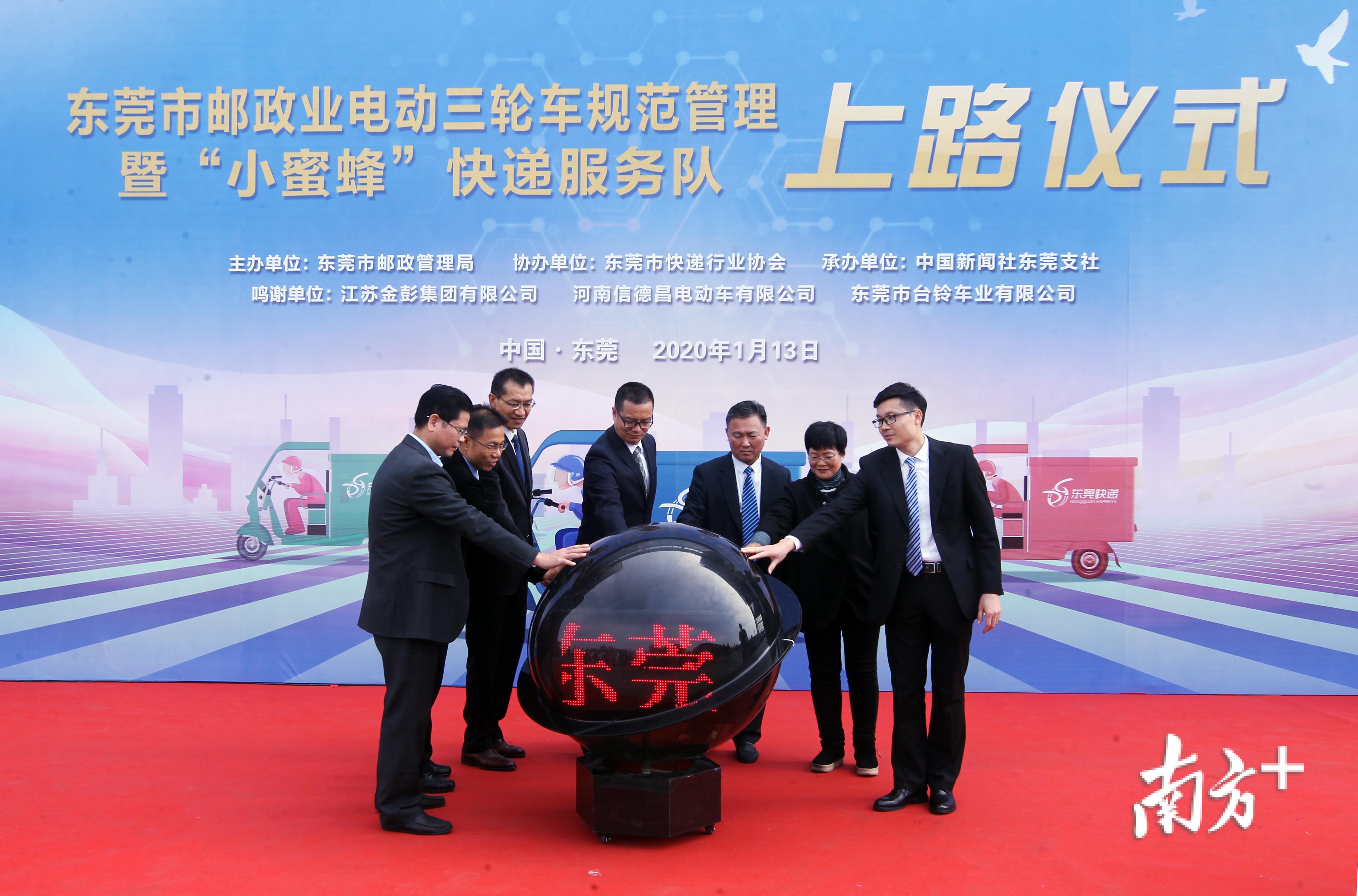 广东省邮政管理局副局长罗德韶、市政府副秘书长黄淦洪、市交通运输局局长朱利民、市邮政管理局局长林蔚、市公安局交警支队林裕杰副支队长等领导分别为企业授予“小蜜蜂快递配送服务队”旗帜。授旗后,快递小哥们共同宣誓承诺文明驾驶,在现场领导和嘉宾共同启动下,东莞“小蜜蜂”快递服务队首批120辆电动三轮车启动上路,奔赴各方进行配送。