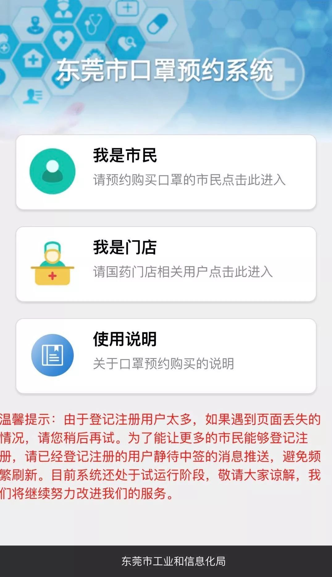 为满足市民购买口罩的需求,我局在“企莞家”平台上临时开发并快速上线口罩预约系统。“企莞家”平台原设计服务对象为我市企业,而口罩预约系统则面向广大市民,因时间紧迫,且运行初期市民关注度高,形成超高的网络流量,导致系统运行阻塞等问题。为此,我局立即启动应急预案,集中力量开展技术攻关。目前,口罩预约系统已恢复正常。本次口罩预约购买采用抽签方式,与预约顺序无关,只需在抽签之前预约成功,即可参与抽签;且预约系统每天24小时开放,市民可以错峰进行登记预约,减少网络拥堵。下来,我们将根据系统运行情况和市民的意见建议继续优化系统,提供更好的用户体验。