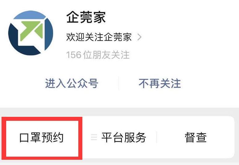市民关注“莞家政务”微信公众号或者“企莞家”微信公众号后,找到“预约口罩”入口。