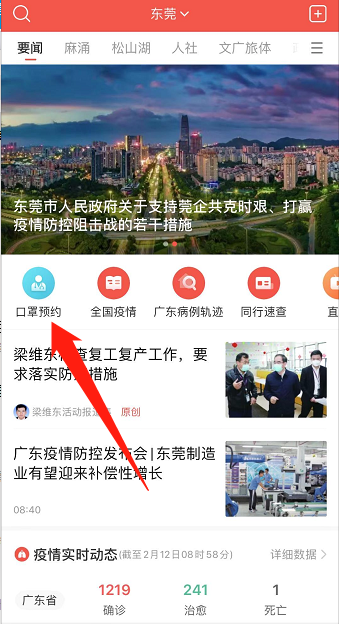 2、进入南方+东莞频道,点击“口罩预约”;