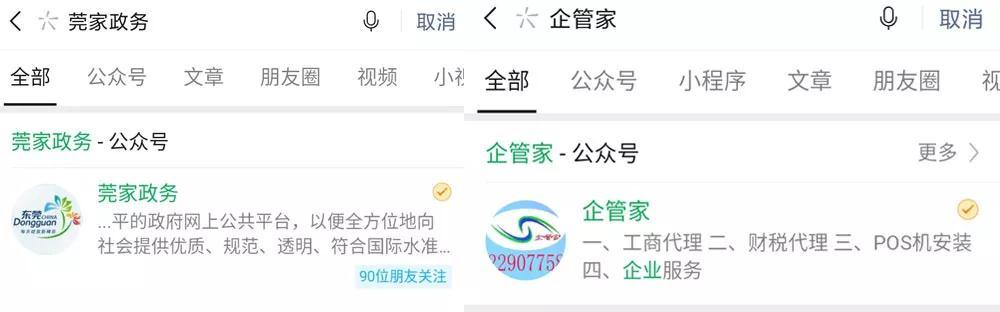 1、微信搜索并关注“企莞家”或“莞家政务”公众号;